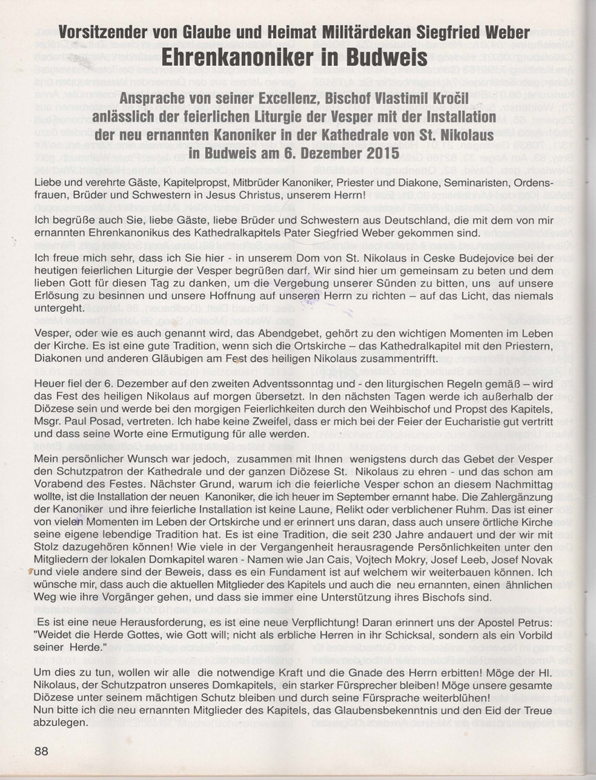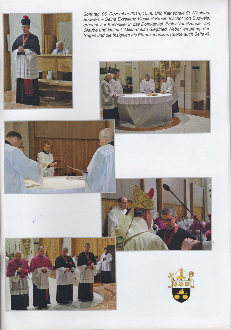 Am 2. Adventsonntag, 06.12.15 und zugleich Fest des Diözesanpatrons des HI. Nikolaus hat Bischof Vlastimil Krocil bei einer feierlichen Kapitelvesper in der Kathedrale von Budweis vier neue Kanoniker installiert, zwei residierende und zwei nichtresidierende (Ehrenkanoniker). Unter ihnen befand sich Militärdekan Siegfried Weber, der erste Vorsitzende des Vereins Glaube und Heimat, aus Ulm.