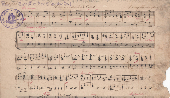Im neueHeimat-Blatt 11/2025 vom November hatte ich über den Dokumentenfund im Turm der Pfarrkirche in Malsching berichtet. Darunter gab es auch viele Notenblätter mit den unterschiedlichsten kirchlichen Musikstücken. Passend zur Weihnachtszeit fand ich zwei Weihnachtslieder komponiert von Franz Reisinger (1838-1905) und fein säuberlich handschriftlich kopiert von den Herren Gustav Weyszer und Rudolf Zwittlinger. Herr Wyszer war in den 20-er bis Anfang der 30-er Jahre Oberlehrer in Malsching. Rudolf Zwittlinger besaß die Tischlerei, gleich am Ortsanfang, da wo heute das Ortsschild steht. Rudolf Zwittlinger war gleichzeitig Organist und Mesner (Mesner Rudl) und nach der Vertreibung auch für Glaube und Heimat einige Jahre Berichterstatter von Malsching.