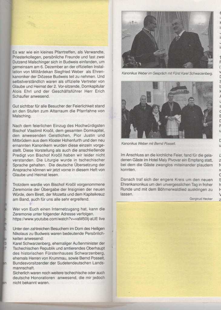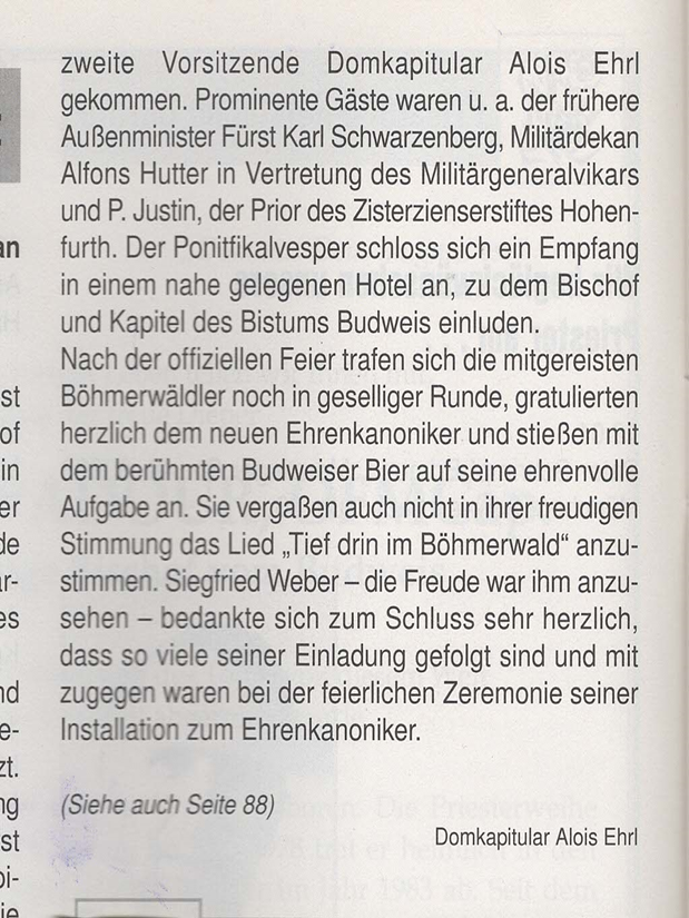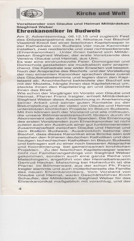 Wie schon der Vorgänger im Vorsitz von Glauber and Heimat. Pfarrer Franz Irsigler, erhielt Militardekan Siegfried Weber diese Auszeichnung in Anerkennung seiner Arbeit and seiner guten Kontakte zu der Bistumsleitung and der vielen von Glaube und Heimat unterstützen kirchlichen Projekte im Bistum Budweis. Mit ihm können sich der Vorstand und alle mitfreuen, die unsere Böhmerwaldzeitschrift fördern durch ihr Abonnement oder durch ihre Spenden. Die Ernennung des ersten Vorsitzenden zum Ehrenkanoniker ist nicht zuletzt auch ein Ausdruck einer gut funktionierenden Zusammenarbeit zwischen Glaube and Heimat und dem Bistum Budweis. Ausdrücklich betonte der Bischof, dass dieses Kanonikat eine Brücke sein soll zwischen den früheren deutschen Katholiken and den heutigen tschechischen Katholiken im Bistum Budweis and beitragen soll zu einer noch besseren Absprache und Koordinierung bei gemeinsamen kirchlichen Projekten. Zu der feierlichen Kapitelsvesper waren nicht nur Familienangehörige von Siegfried Weber gekommen, sondern auch eine ganze Reihe von Malschingern, angeführt von der Heimatbetreuerin Gertrud Hecker. Malsching bei Hohenfurth ist die Pfarrei im Böhmerwald, aus der schon Pfr. Franz Irsigler stammte and auch mütterlicherseits die Familia des neuen Ehrenkanonikers. Vom Vorstand von Glaube und Heimat. waren Geschäftsführer Erich Schaufler, der Militärdekan Siegfried Weber für das Ehrenkanonikat maßgeblich mit vorschlug, und der zweite Vorsitzende Domkapitular Alois Ehrl gekommen. Prominente Gäste waren u. a. der frühere Außenminister Fürst Karl Schwarzenberg, Militärdekan Alfons Hutter in Vertretung des Militärgeneralvikars und P. Jstin, der Prior des Zisterzienserstiftes Hohenfurth. Der Pontifikalvesper schloss sich ein Empfang in einem nahe gelegenen Hotel an, zu dem der Bischof und das Kapitel des Bistums Budweis einluden.